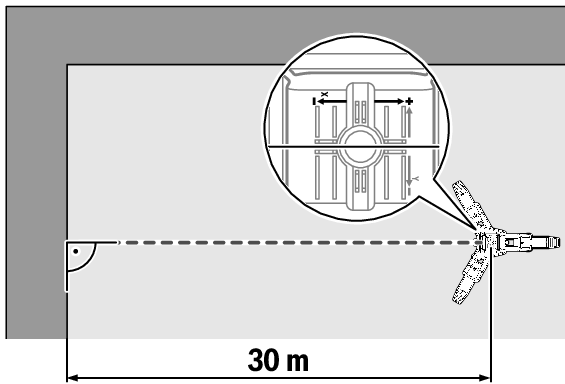 Montieren Sie das Messwerkzeug in Horizontallage 30 m von der Wand entfernt auf dem Stativ (39) (empfohlen) oder stellen Sie es auf festen, ebenen Untergrund.