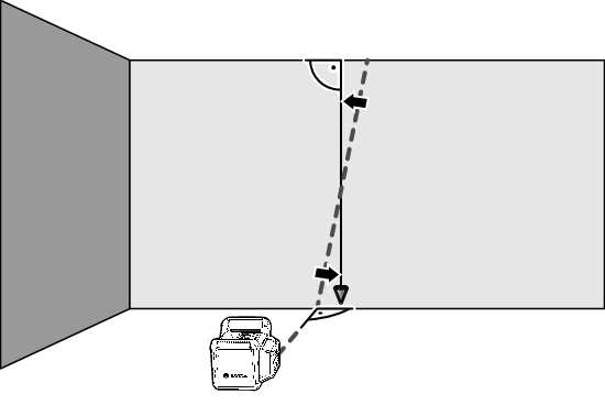 Stellen Sie das Messwerkzeug in Vertikallage auf festen, ebenen Untergrund. Schalten Sie das Messwerkzeug ein und lassen Sie es einnivellieren. Richten Sie das Messwerkzeug so aus, dass der variable Laserstrahl rechtwinklig auf die Wand trifft und die Lotschnur schneidet. Schalten Sie das Messwerkzeug aus.