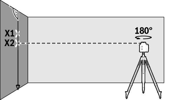Markieren Sie die Höhe des Laserstrahls an der Wand als Höhe X2. Bei Bedarf verwenden Sie dazu den Laserempfänger (37). Achten Sie darauf, dass die Höhe X2 möglichst senkrecht über bzw. unter der Höhe X1 liegt.