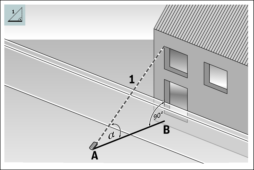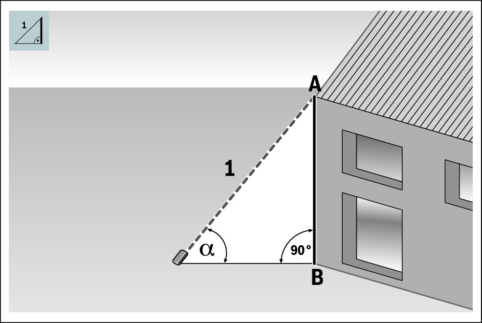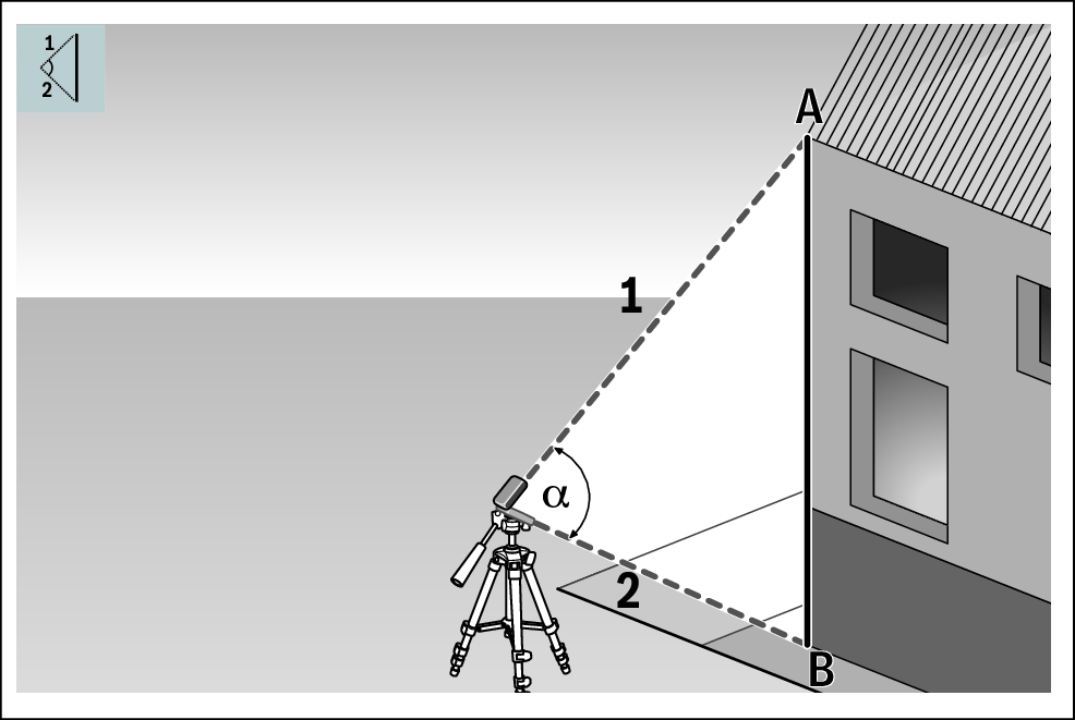 间接距离测量用于确定无法直接测量的距离,例如有障碍物阻挡了光路或者没有目标面可以充当反射体时。该测量方法只适用于垂直方向。任何水平方向的偏差都会导致测量错误。