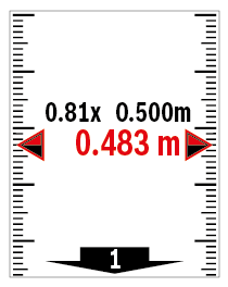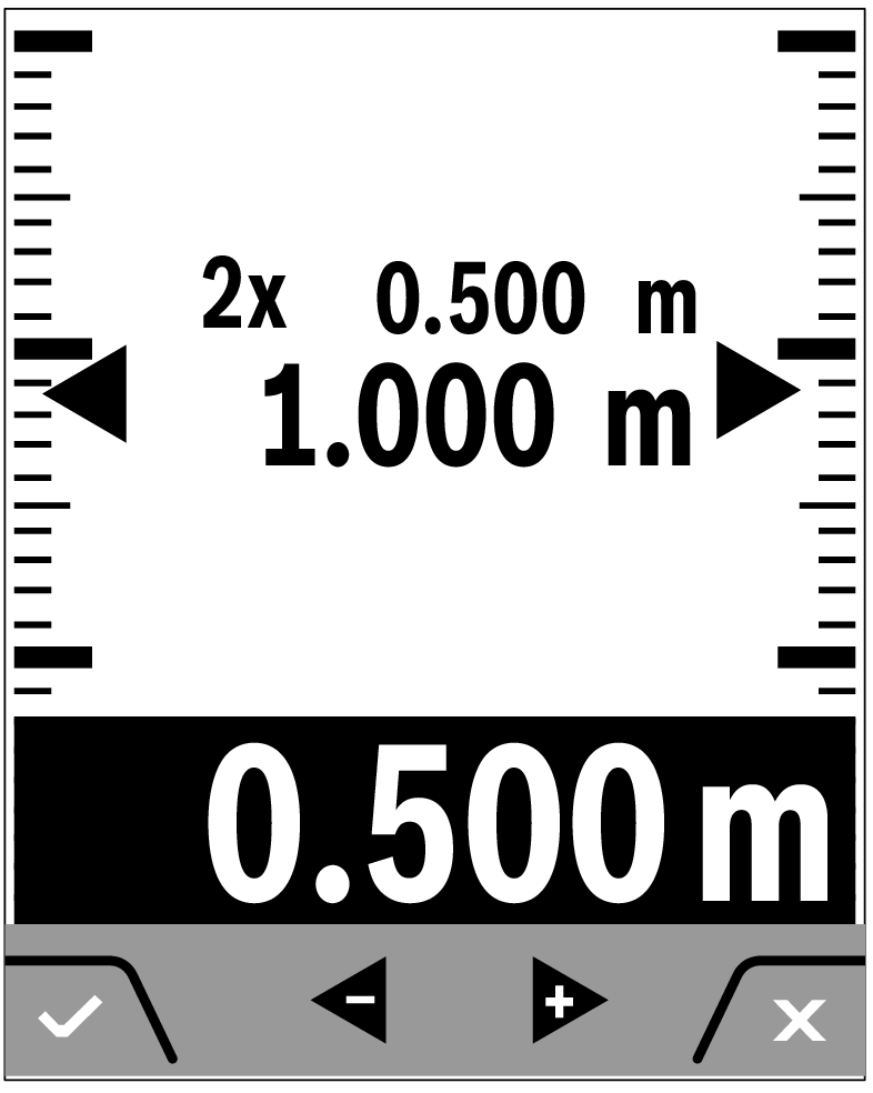 - 测量仪连续测量到起点的间距。同时显示定义的长度以及当前的测量值。下部或上部箭头指示到下一个或上一个标记的最小距离。