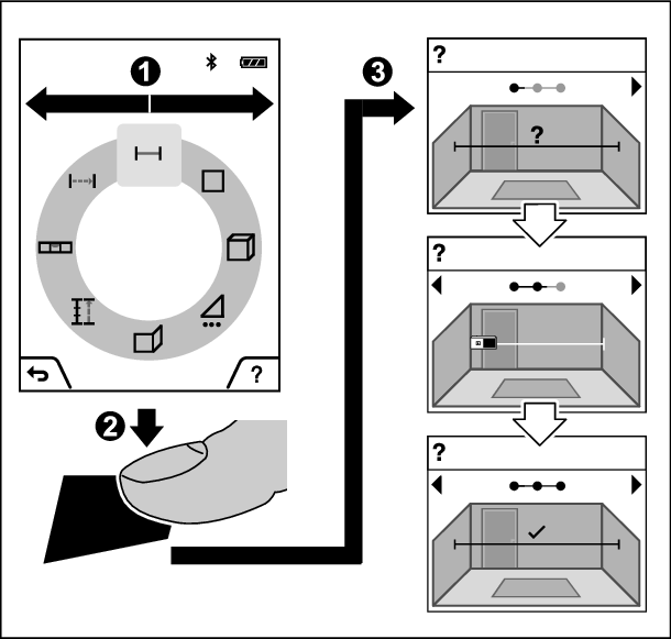 在持续测量时,测量值会不断更新。例如,您可以从一堵墙出发,移动所需的距离,这样将随时可以读取当前的距离。