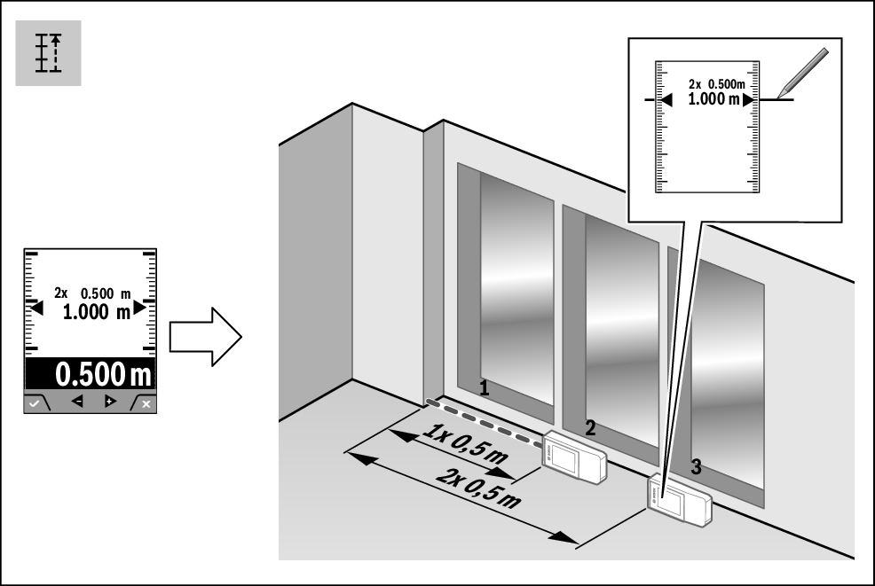 放样功能重复测量某个定义的长度(线段)。这些长度可以传递到某个表面上,例如能够将材料剪切成相同长度的工件或建立干墙式墙架结构。可调节的最小长度为0.1米,最大长度为50米。