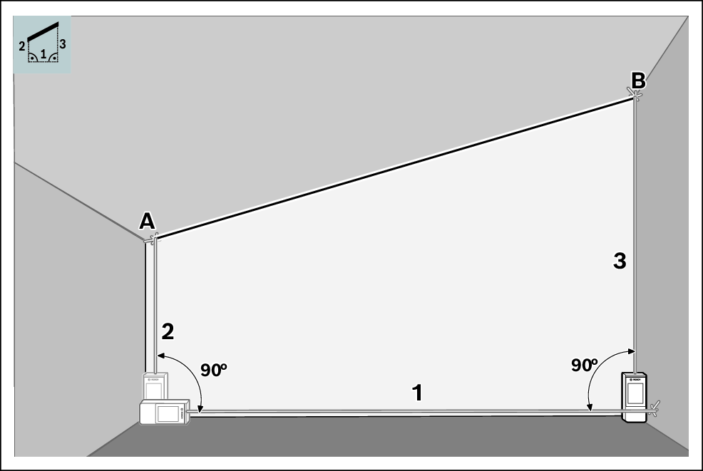 通过梯形测量,可以确定诸如屋顶坡面的长度。您可以通过依次测量线段1、2和3,以确定线段AB。测量仪从线段1、2和3计算出所求的线段AB。