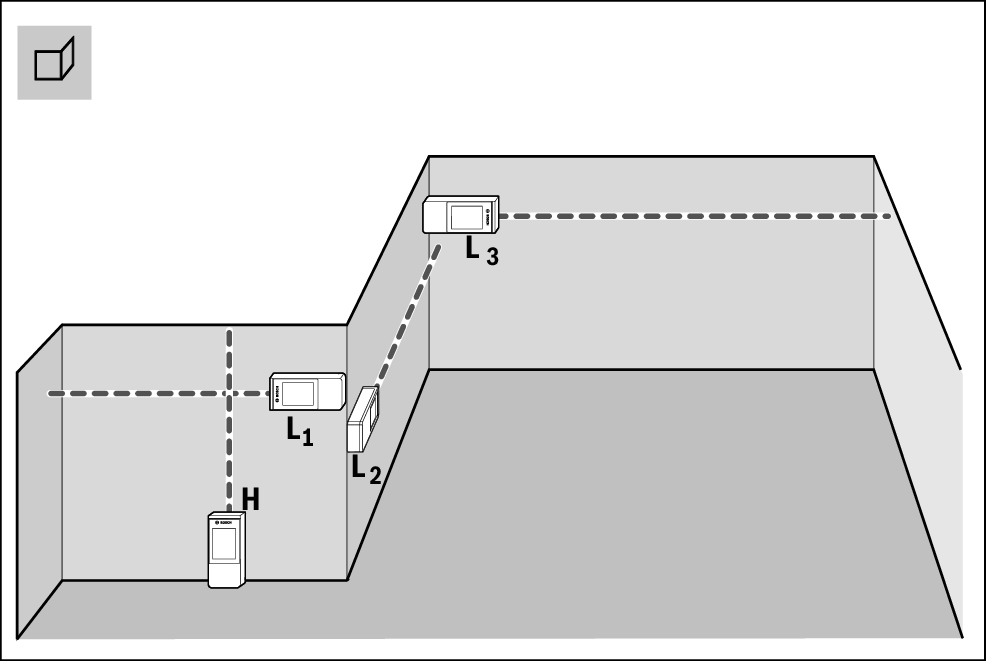 间接距离测量用于确定无法直接测量的距离,例如有障碍物阻挡了光路或者没有目标面可以充当反射体时。该测量方法只适用于垂直方向。任何水平方向的偏差都会导致测量错误。