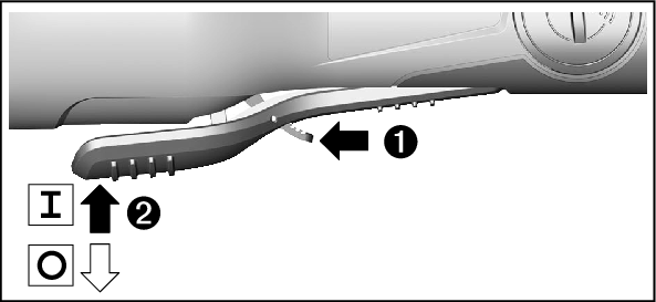 To lock the on/off switch (5) in position, push the on/off switch (5) forward and down until it clicks into place.