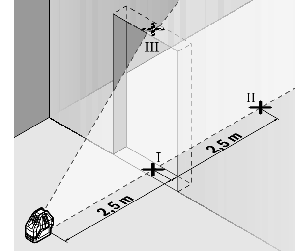 - Mark the centre of the vertical laser line on the floor of the door opening (point Ⅰ), 5 m away on the other side of the door opening (point Ⅱ) and on the upper edge of the door opening (point Ⅲ).
