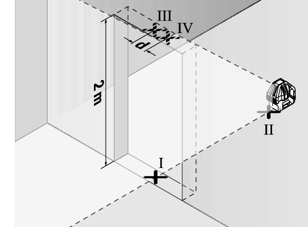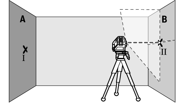 - Align the height of the measuring tool (using the tripod or by placing objects underneath as required) so that the point where the laser lines cross exactly hits the previously marked point Ⅱ on wall B.