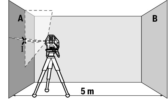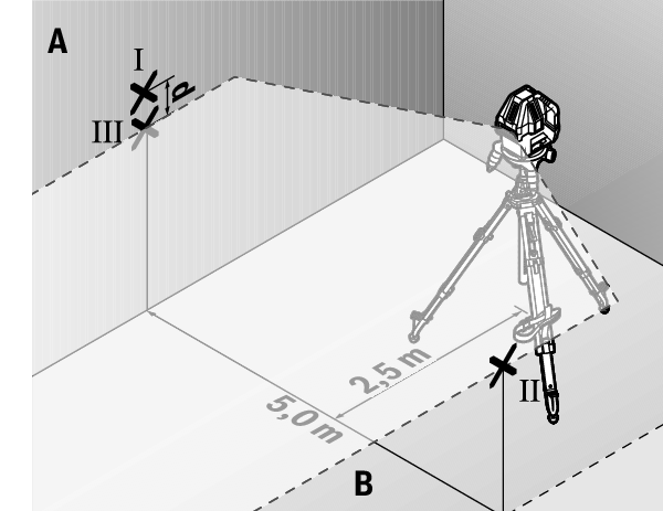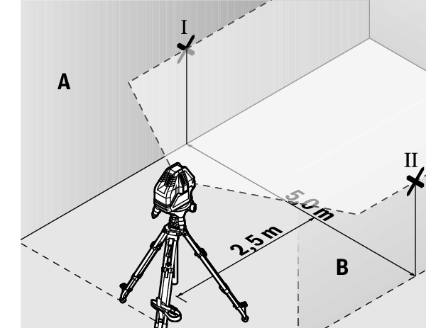 - At a distance of 2.5 m from the measuring tool, mark the centre of the laser line on both walls (point Ⅰ on wall A and point Ⅱ on wall B).