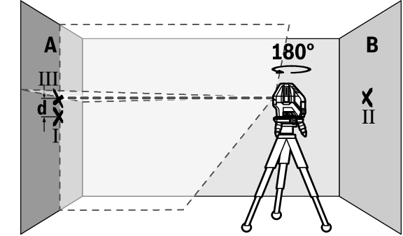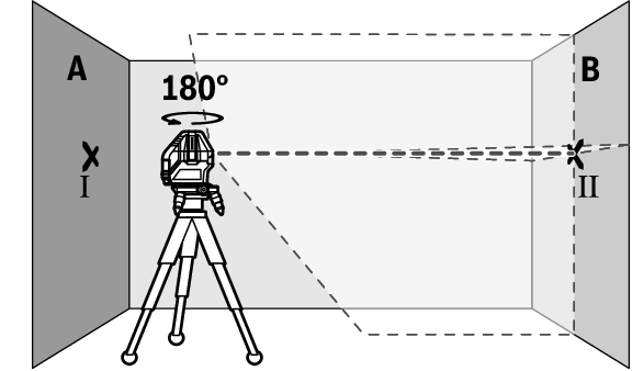 - Turn the measuring tool 180°, allow it to level in and mark the point where the laser lines cross on the opposite wall B (point Ⅱ).